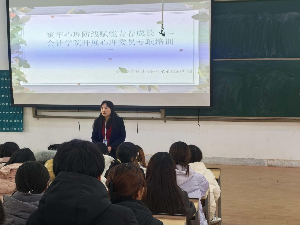 为进一步强化班级心理健康教育工作力量,提升心理委员的专业素养与实践能力,充分发挥其在学生心理健康服务中的前沿作用,12月4日,会计学院在教学4号楼118教室开展心理委员专项培训。会计学院心理辅导站副站长赵鑫鑫老师、会计学院心航路社团社长骆笑娟,会计学院2025级全体心理委员参与此次培训。