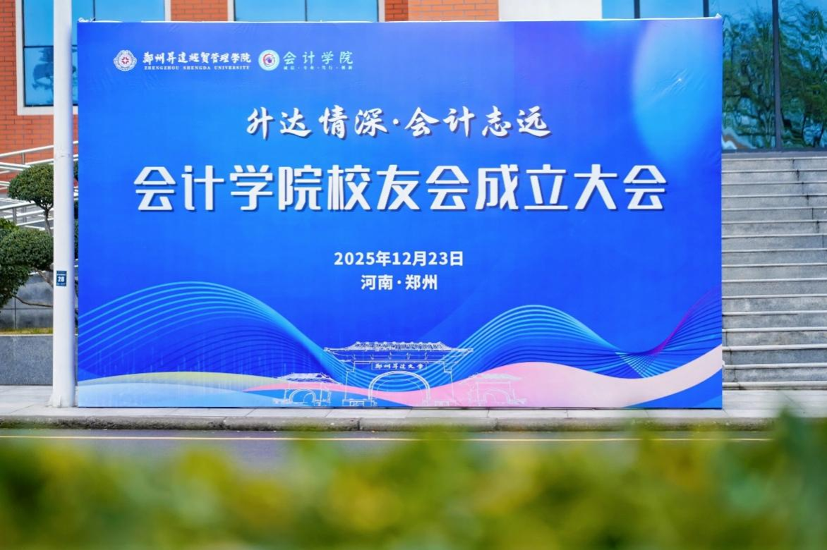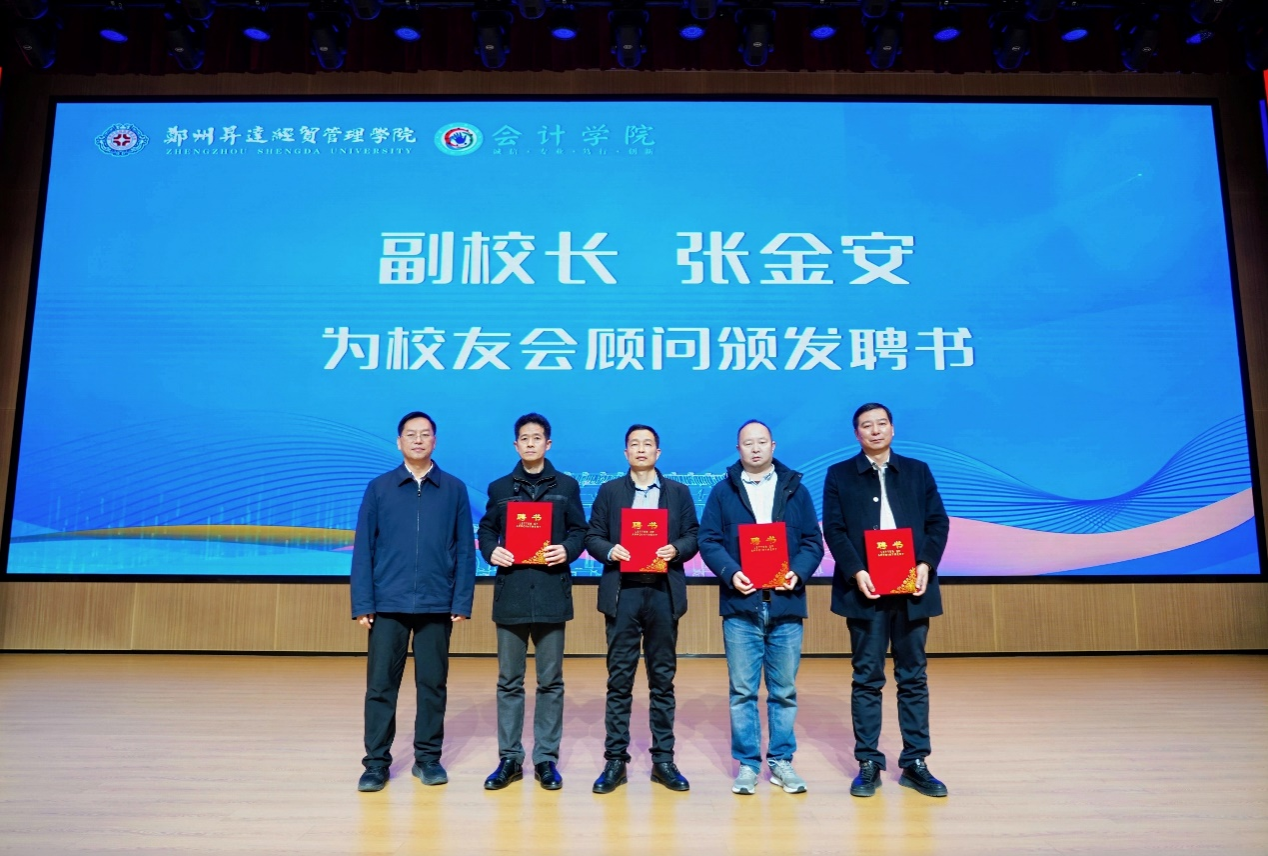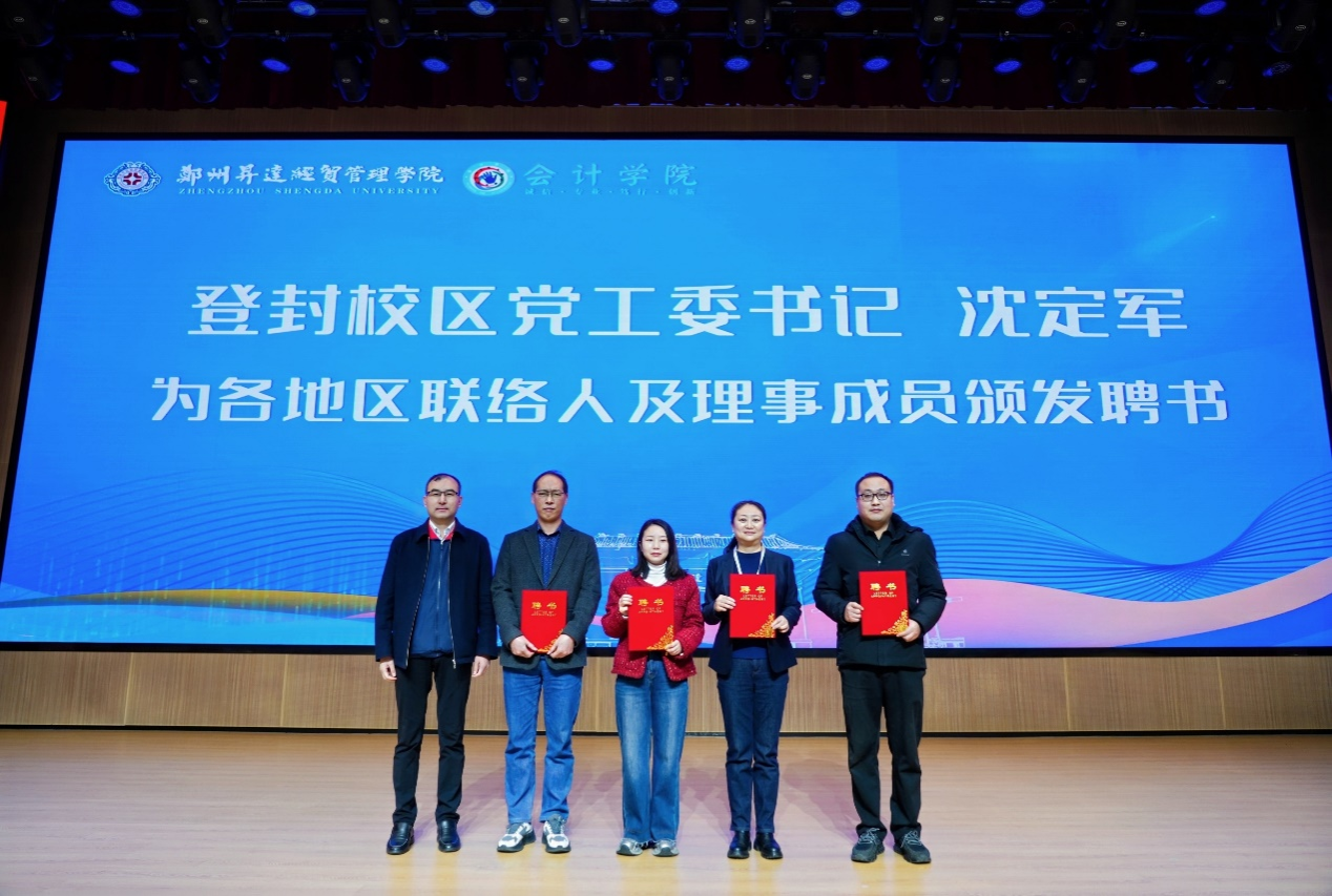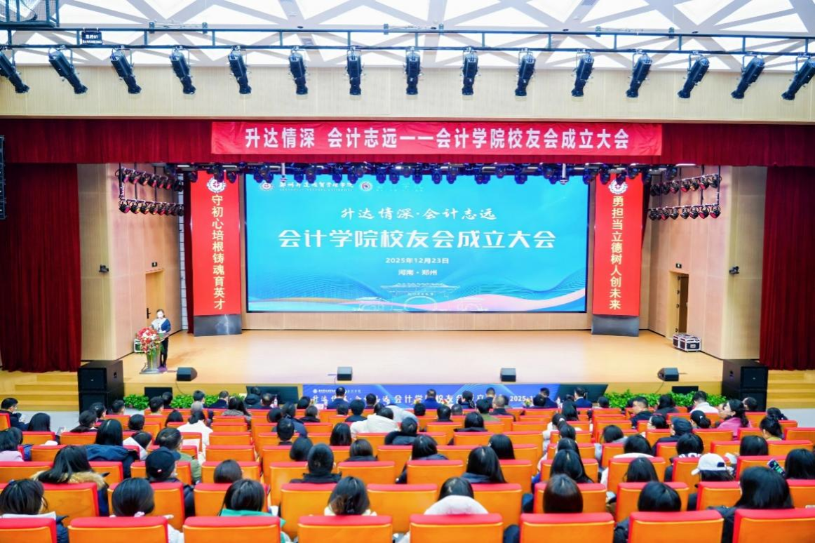 2025 年 12 月 23 日上午,郑州升达经贸管理学院会计学院校友会成立大会在图书馆三号报告厅成功举行。董事长王新奇博士,校党委副书记、副校长、工会主席张金安,校党委委员、副校长张其武,副校长方建印,登封校区党工委书记沈定军等校领导出席大会。参加大会的部门主管有董事会办公室主任、科研处处长杨存博,校长办公室主任郝艳海,就业处处长、校友办主任冯科,财务处长张延霞,登封校区管委会办公室主任、党建工作部部长刘昊,校地合作处处长王彦雨,教务处副处长袁向阳。参加大会的校友有:升达全国校友总会会长周延翟,升达全国校友总会秘书长、会计学院校友会会长牛草,升达河南校友会会长、会计学院校友会顾问邵明,升达河南校友会秘书长陈帅甫,会计学院校友会顾问团成员李军、高磊、刘东坡,副会长刘贺军、芦艳萍,秘书长支学雷,副秘书长滑智鹏、张千,华中校友联络人李鹏伟、杨志超,留校校友联络人何保国老师、崔杰,理事成员刘锦燕,以及来自各地的优秀校友代表和在升达工作的校友们。参加大会的还有会计学院的院长王宝庆,党委书记张蕾,副院长兼党委副书记张新成,副院长毕鹏翾,党委副书记陈刚,教学秘书李永利及在校师生代表等。