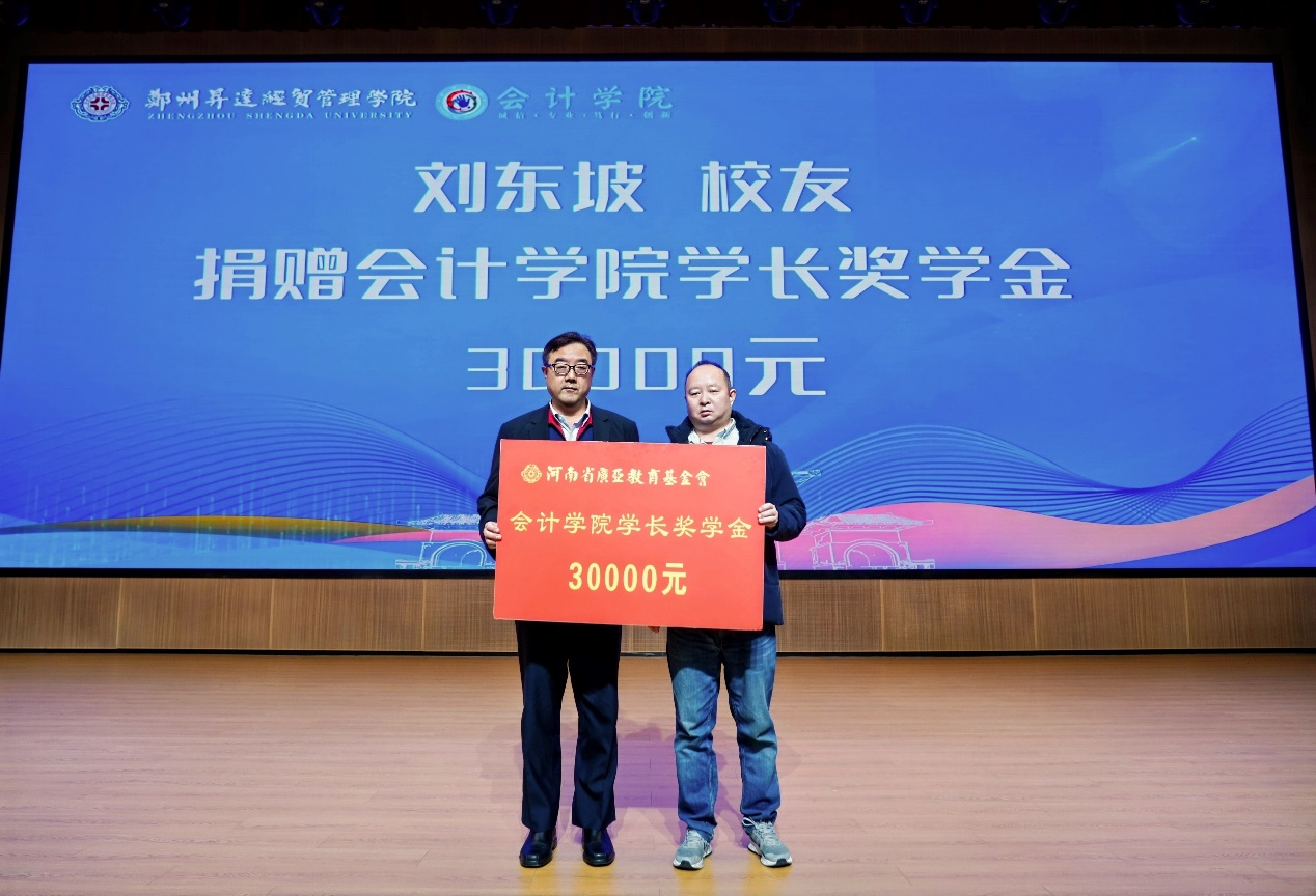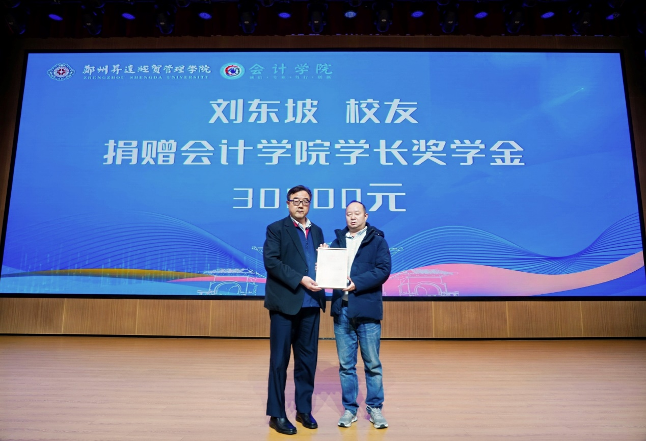 1996级校友刘东坡现场向母校再次捐资3万元,用于“会计学院学长奖学金”。该奖学金由刘东坡校友于2024年捐资设立,旨在奖励学院品学兼优的学生,每年评选10名获奖者,每人奖励1000元,至今已有20名学生获此殊荣。