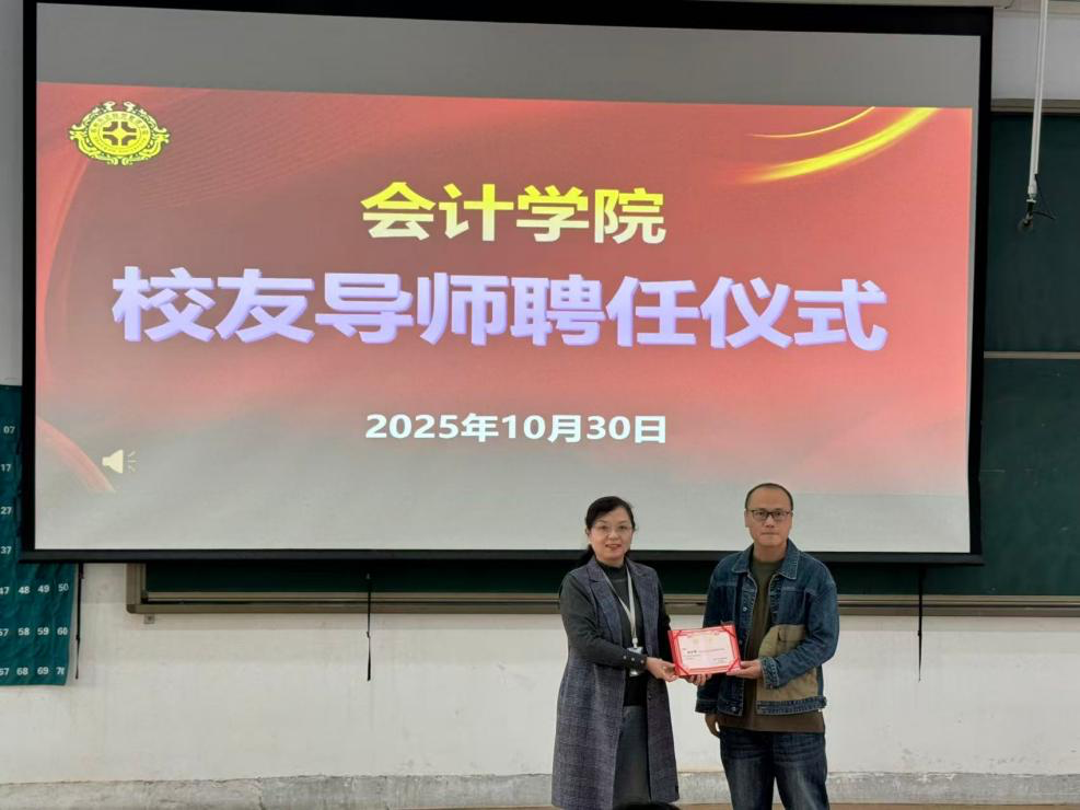 在分享会前,会计学院党委书记张蕾为杨宗辉校友颁发校友导师聘书。