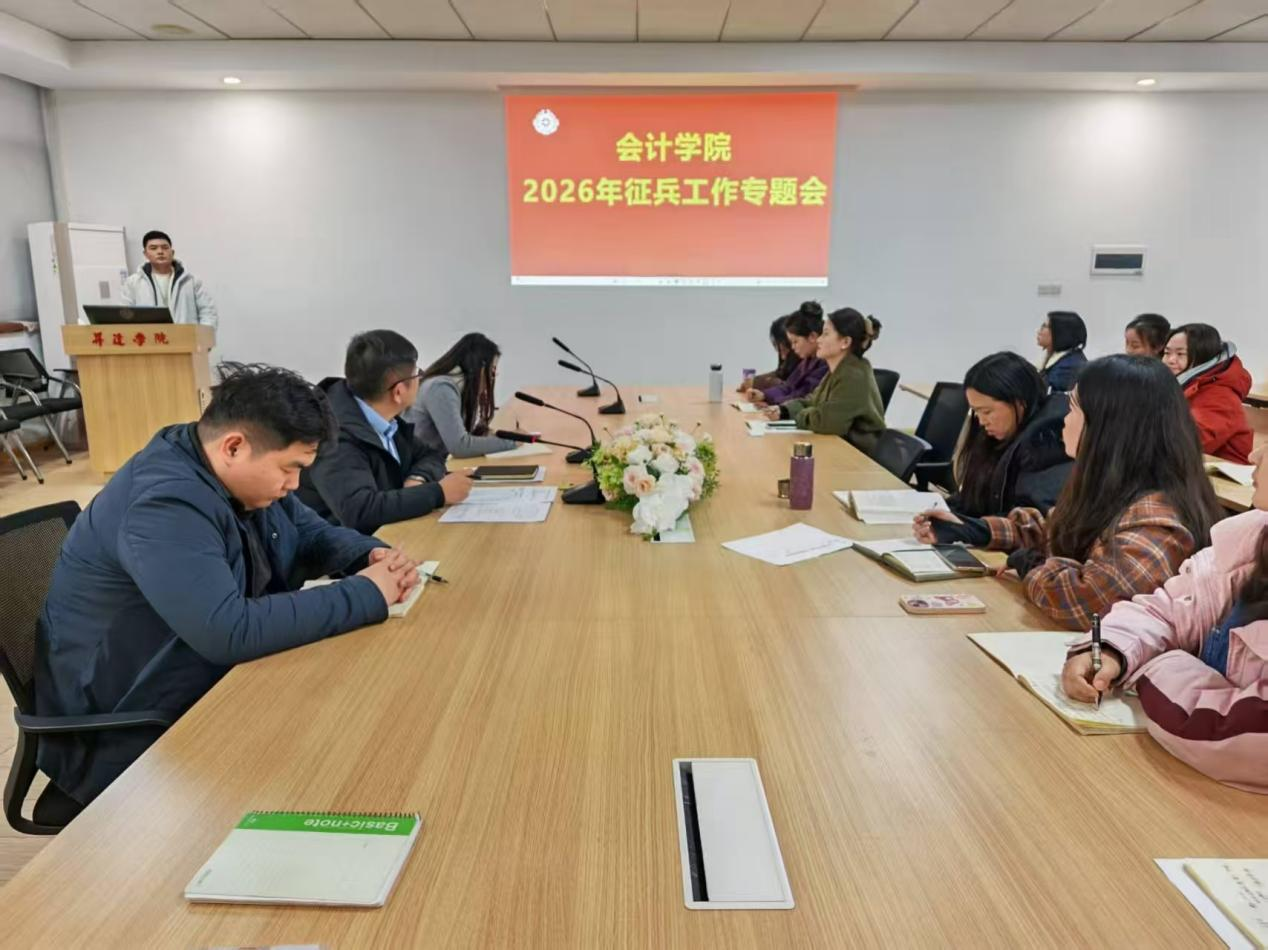 为积极响应国家征兵号召,扎实做好会计学院2026年上半年征兵工作,鼓励毕业生踊跃报名参军,12月23日下午,会计学院组织开展了2026年征兵工作专题会,会计学院党委副书记陈刚、征兵专员路飞龙老师及会计学院全体辅导员参加了本次专题会。
