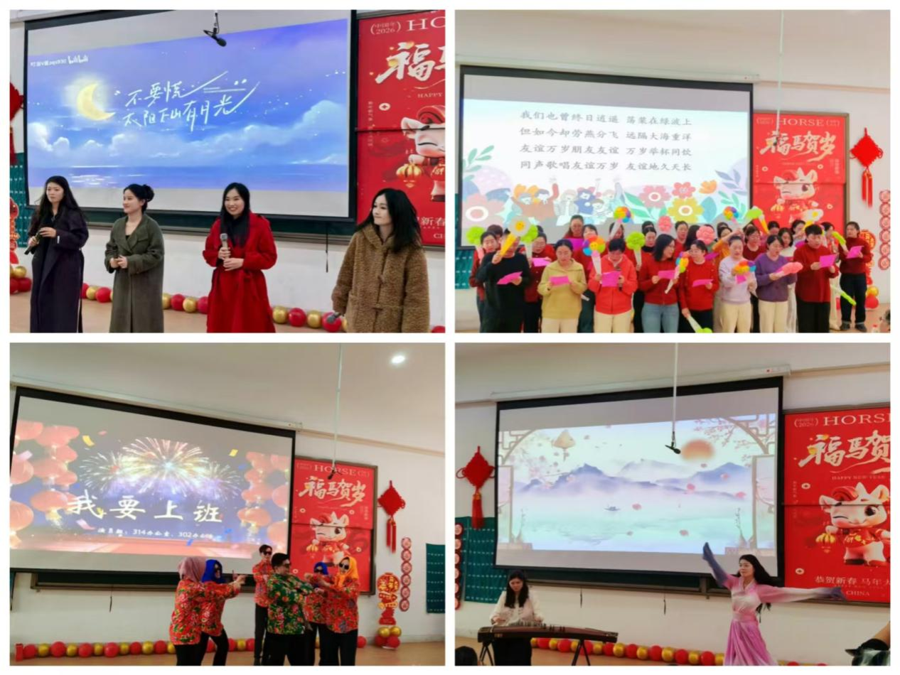 会计学院领导班子成员,以饱含深情的诗章《温情聚首辞旧岁,逐光前行绽华章》为汇演拉开序幕,声韵起处,尽是旧岁温存。会计教研室307带来的舞蹈《福气要来到》灵动活泼,洋溢着喜庆祥和的新春气息。财务管理教研室合唱的《梦驼铃》悠远深情,唤起岁月沉淀的集体记忆。学工206办公室的老师们倾情演绎经典豫剧《朝阳沟》选段,将豫剧独有的质朴唱腔、浓郁乡土气息与生动表演融为一体。随后,周锋、张靖宜、李嘉慧三位老师共同献唱《雨蝶》,歌声婉转动人。财务管理教研室的舞蹈《月亮照山川》以优美舞姿展现山河如画的意境。学工308办公室的歌曲《不要慌太阳下山有月光》温暖治愈,传递出从容乐观的生活态度。205办公室与陈刚老师联合演绎的语言类节目《护航青春暖同行,筝韵欢语贺新春》生动幽默,融入古筝演奏与新春祝福。王筱红、陈凌宇两位老师的葫芦丝演奏《映山红》旋律悠扬,红色经典唤起深深情怀。税收教研室的歌曲《上春山》清新明快,充满早春的生机与希望。董婉婉、孟丽君两位老师表演的舞蹈《惊鸿舞》衣袂翩跹,展现古典舞的优雅韵味。周锋、张靖宜、李嘉慧再次登台,共同演绎歌曲《情人》,歌声深情款款。审计教研室的歌曲《童年》轻快活泼,勾起美好校园回忆。数智化会计教研室带来的金曲串烧,旋律连贯,带来一波“回忆杀”。学工302、314办公室的舞蹈《我要上班》编排新颖、风趣生动,展现了教职工敬业乐群的精神面貌。会计教研室的合唱《友谊地久天长》温情动人,唱出了同事之间深厚的情谊。管理会计教研室的歌曲《相亲相爱》旋律欢快,诠释了会计学院大家庭的温暖与团结。会计教研室207的舞蹈《风雨彩虹,铿锵玫瑰》飒爽有力,展现女性教职工的自信风采。最后,全体教职工共同唱响《明天会更好》,歌声激昂、情感真挚,为整场汇演画上圆满但又充满希望的句号。