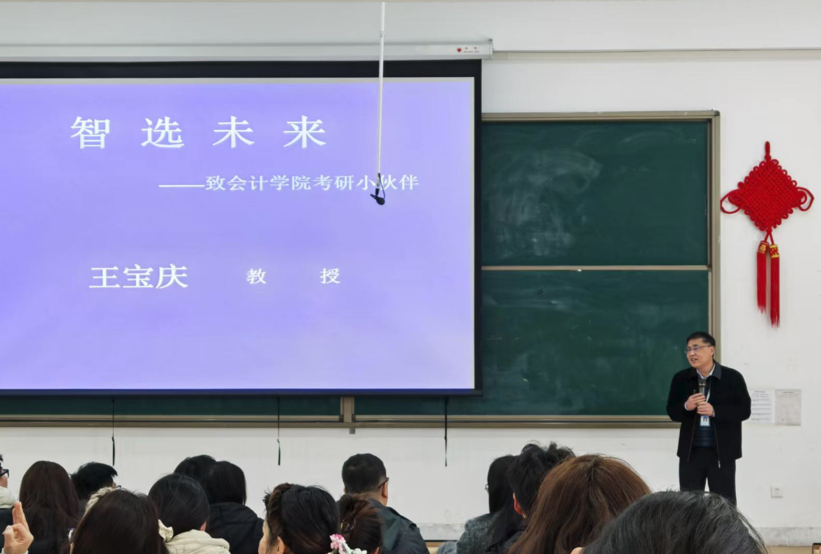 会计学院高度重视此次考研复试帮扶工作,将模拟面试作为提升学子复试竞争力的重要举措,周密部署、精准发力。3月13日上午10:30,院长王宝庆教授在教学四号楼118大教室,为会计学院全体考研过线考生作考研复试专题指导报告,结合历年复试趋势与院校招录特点,为学子们明确了复试备考方向、拆解了备考重点、传授了应试方法,有效缓解了考生的备考焦虑。