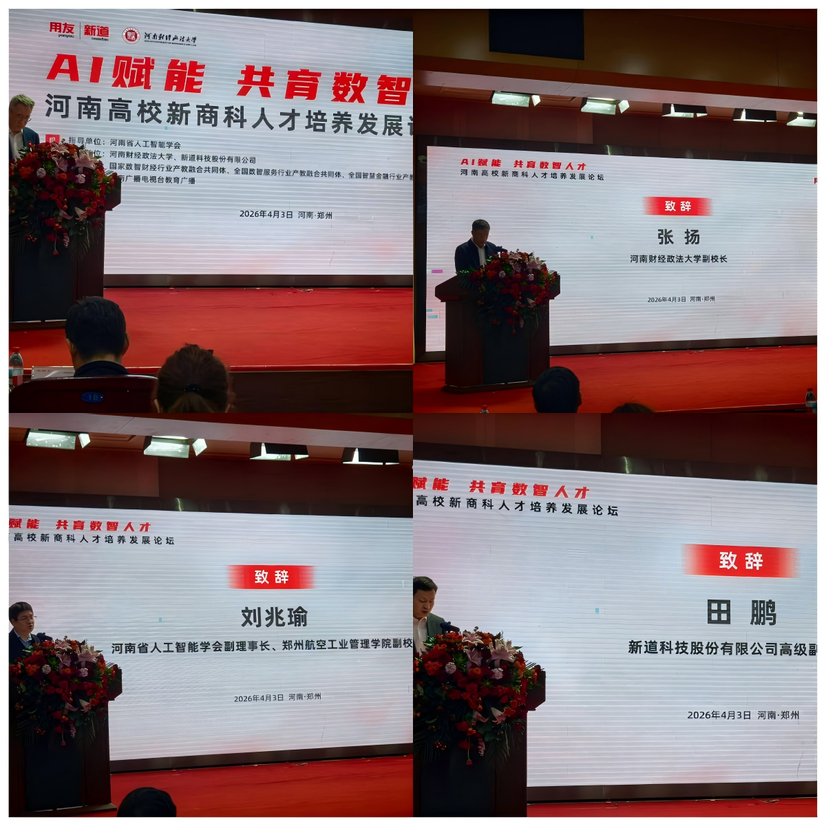 为积极探索AI技术赋能商科教育的新路径,推动数智化财会人才培养与产教深度融合,4月3日,会计学院院长王宝庆、副院长张新成、数智化教研室主任田丽丽、教师贺岚、张洁一行5人赴河南财经政法大学参加“AI赋能 共育数智人才——河南高校新商科人才培养发展论坛”。本次论坛由河南财经政法大学与新道科技股份有限公司联合主办,聚焦AI赋能商科教育、数智化人才培养、产教深度融合等核心议题,来自省内外的专家学者、高校代表齐聚一堂,共同探讨AI时代商科教育的变革趋势与创新路径。