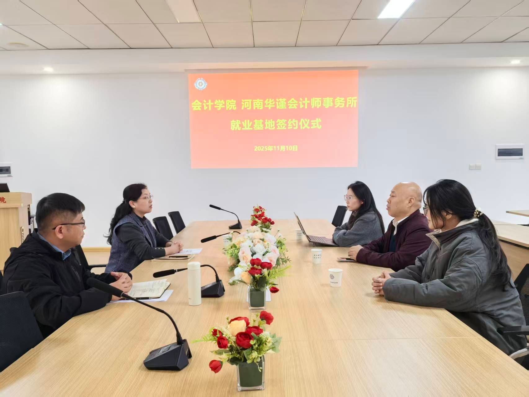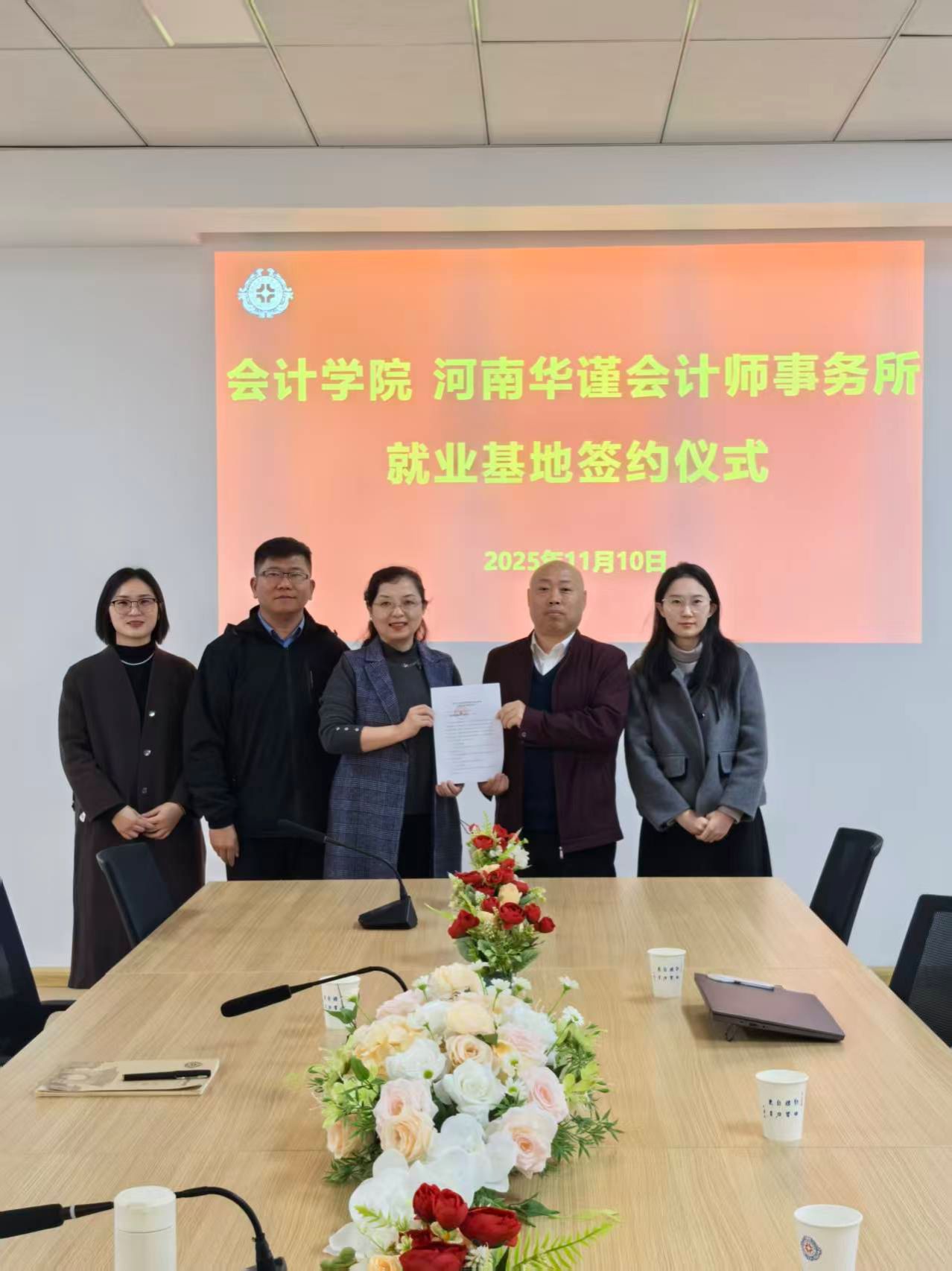 为进一步加强校企协同育人,提升学生实践能力与就业竞争力,11月10日,会计学院与河南华瑾会计师事务所校企合作就业实习基地签约仪式在学院209会议室顺利举行。会计学院党委书记张蕾、党委副书记兼团委书记陈刚、负责就业工作的老师刘爽,以及河南华瑾会计师事务所企业代表出席了签约仪式。