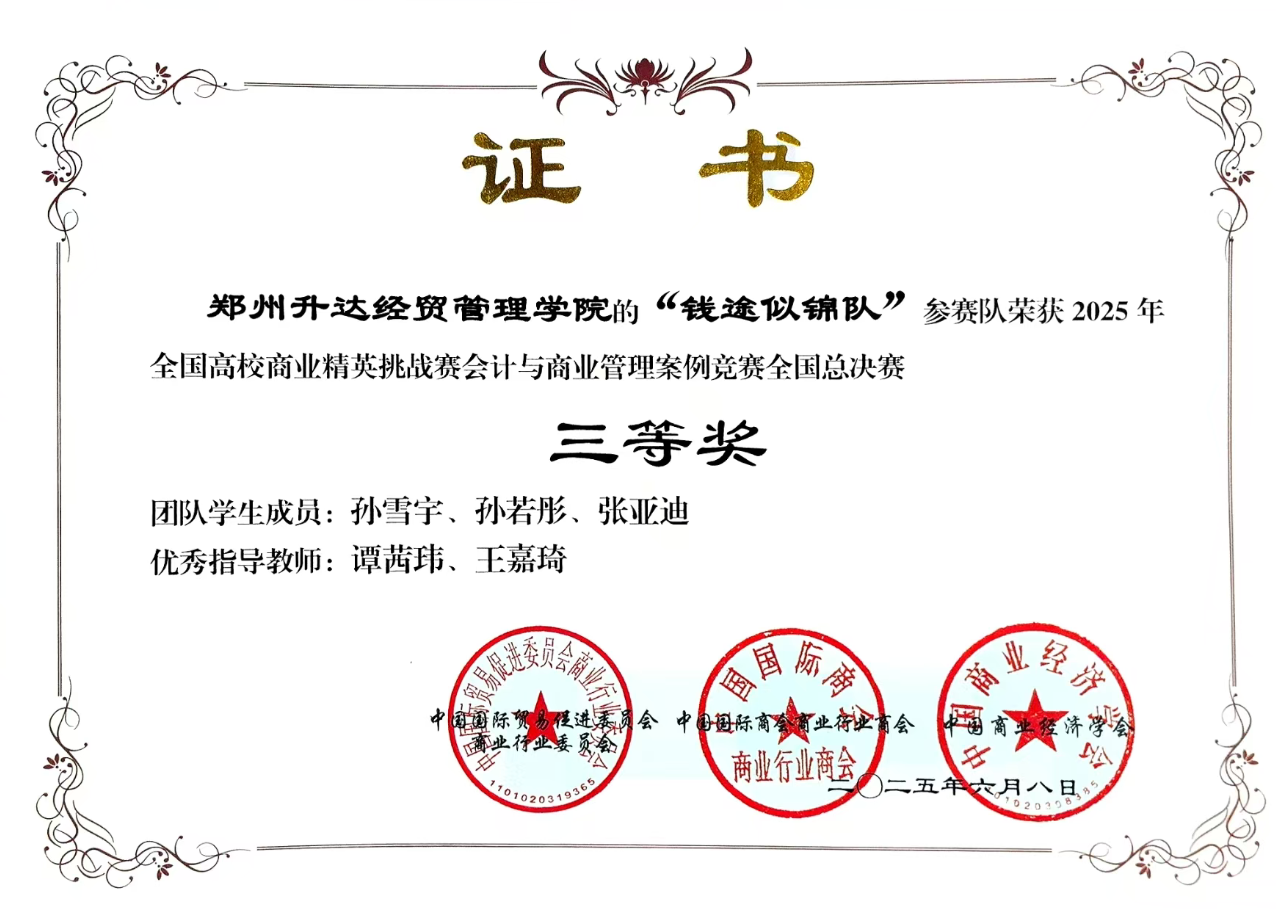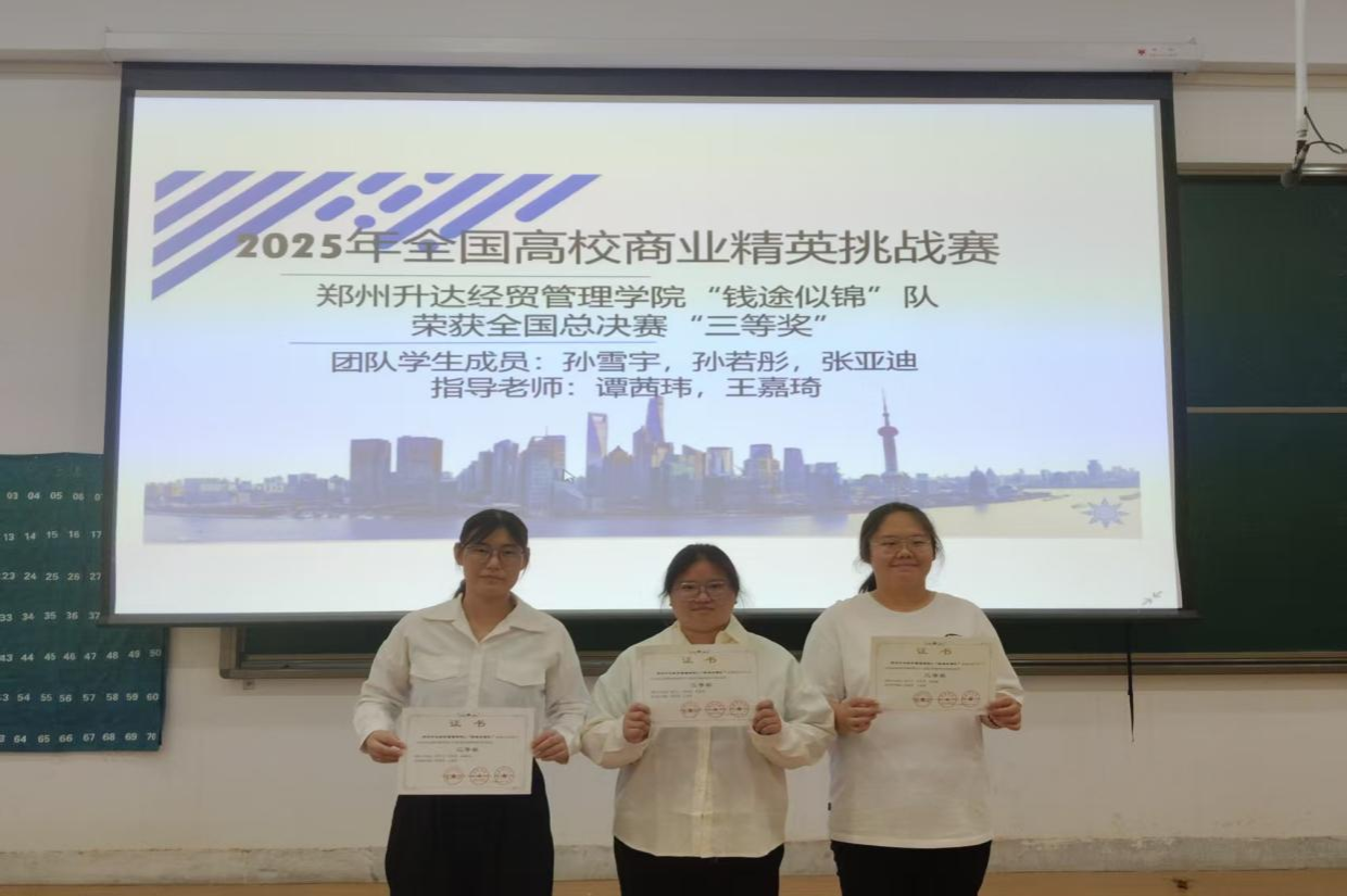 2025年全国高校商业精英挑战赛会计与商业管理案例竞赛全国总决赛圆满落幕。在这场高水平赛事中,我校会计学院谭茜玮、王嘉琦两位老师联合指导,2022级会计学本科4班孙雪宇、孙若彤、张亚迪三位同学组成的参赛队伍,凭借扎实的专业功底与出色的综合能力,成功斩获全国三等奖,充分彰显了我校会计学子在创新实践领域的实力。
