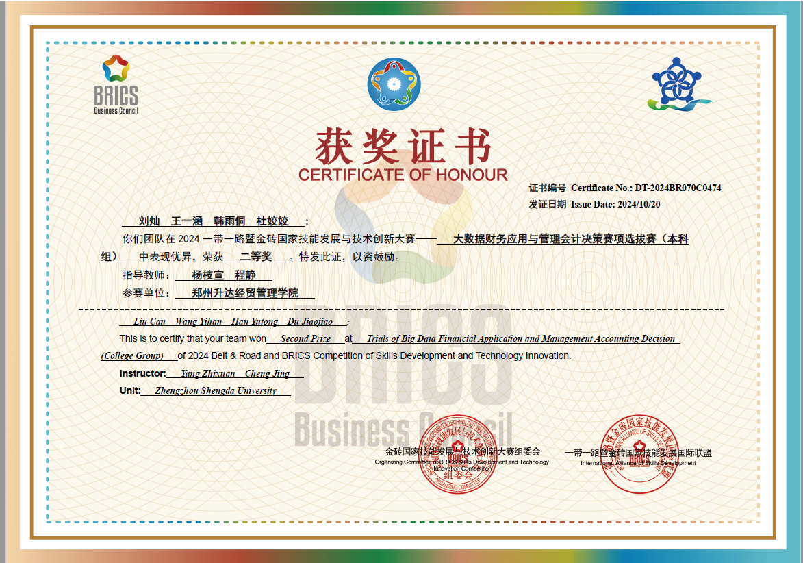2024年10月20日,由金砖国家技能发展与技术创新大赛组委会、一带一路暨金砖国家技能发展国际联盟主办的“2024一带一路暨金砖国家技能发展与技术创新大赛(大数据财务应用与管理会计决策赛项本科组)”区域赛落下帷幕。我校会计学院代表队在比赛中表现优异,一举斩获了北区二等奖和三等奖。