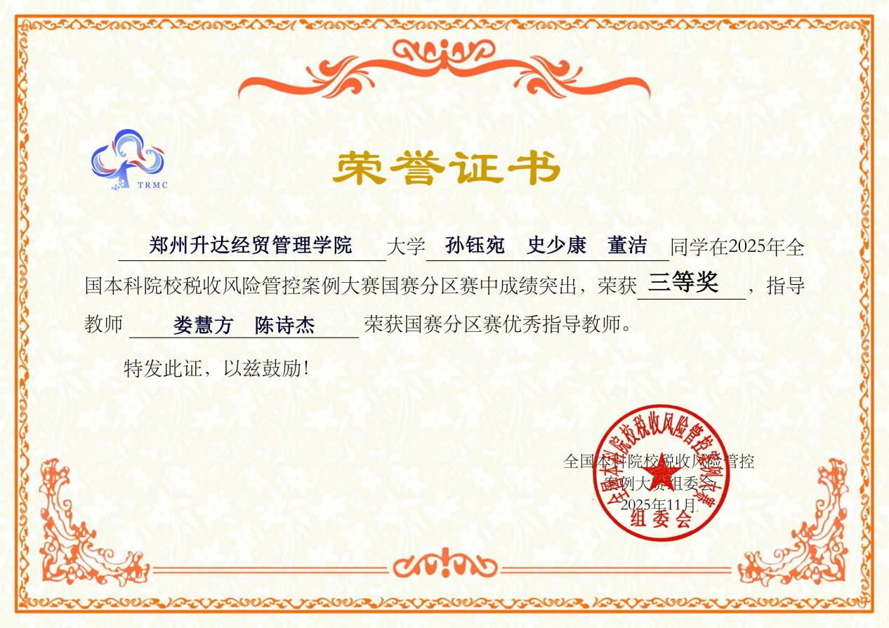 近日,2025年全国本科院校税收风险管控案例大赛国赛分区赛获奖名单公布。我校会计学院2024级会计专升本5班孙钰宛、2023级会计学本科5班史少康、2024级审计学本科1班董洁三位同学组成的参赛团队表现突出,荣获2025年全国本科院校税收风险管控案例大赛国赛分区赛三等奖。指导教师娄慧方、陈诗杰荣获“国赛分区赛优秀指导教师”称号。