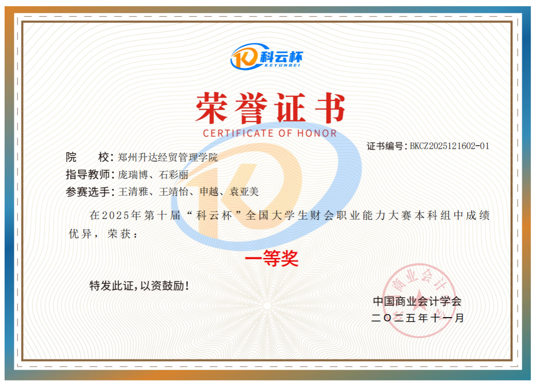 会计学院高度重视此次竞赛,坚持“以赛促教、以赛促学、学赛结合”,紧密对接“1+X”证书制度、行业标准和企业岗位需求,依托智能财务云平台等信息技术,将智能财务融入实践教学,切实提升学生的实践能力与综合素质。此次比赛中,会计学院派出两支代表队参赛,分别为由2023级财务管理本科2班刘怡、李淑婷、韩依煊、孟江楠组成的锦鲤附组和由2023级审计本科3班王清雅、申越、王靖怡和2023级财务管理本科1班袁亚美组成的四力破云团。两支代表队在庞瑞博、师玉平、石彩丽、王梦园等四位教师的悉心指导下,凭借扎实的专业功底和团队协作能力,锦鲤附组获得一等奖,四力破云团获得二等奖。