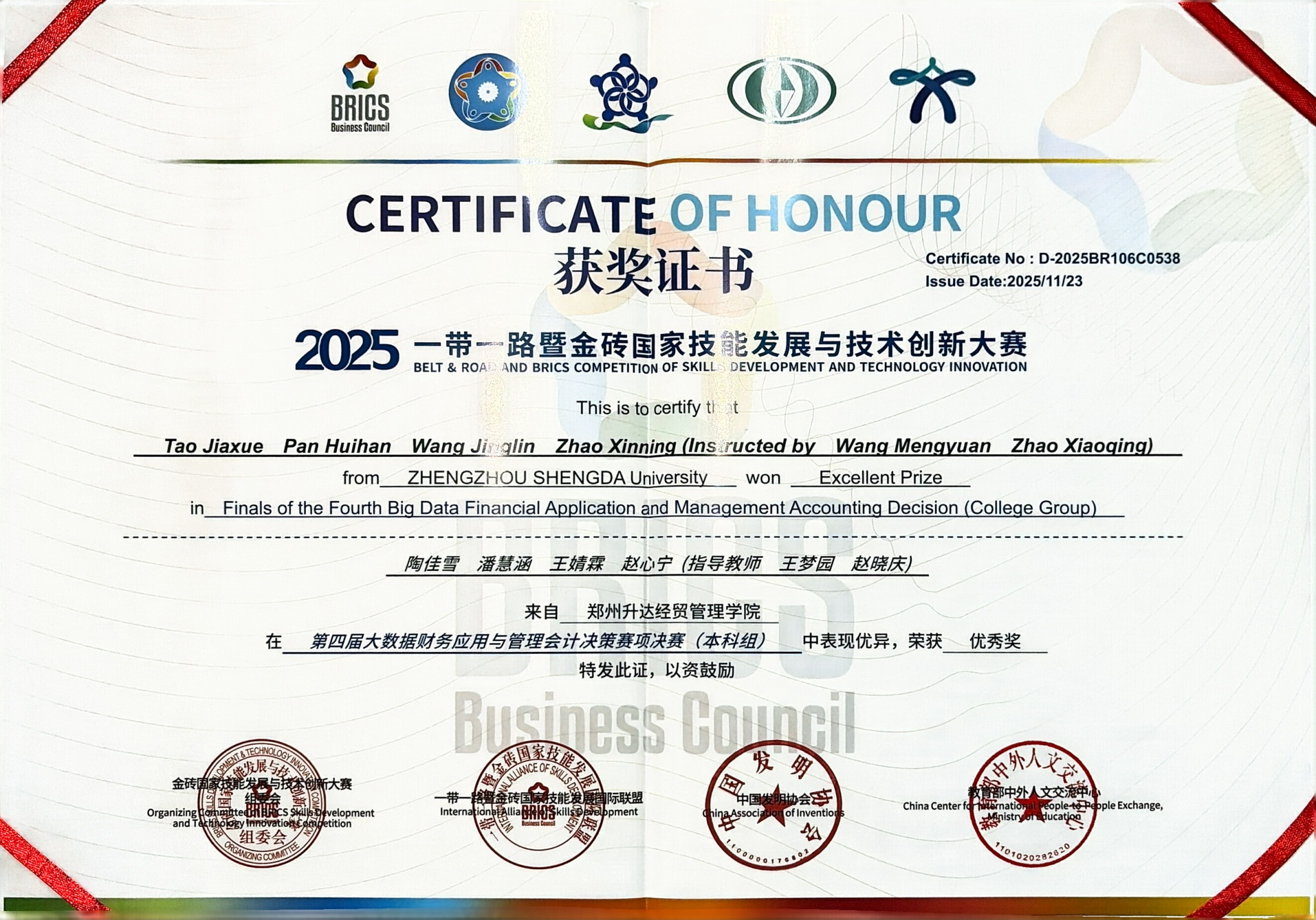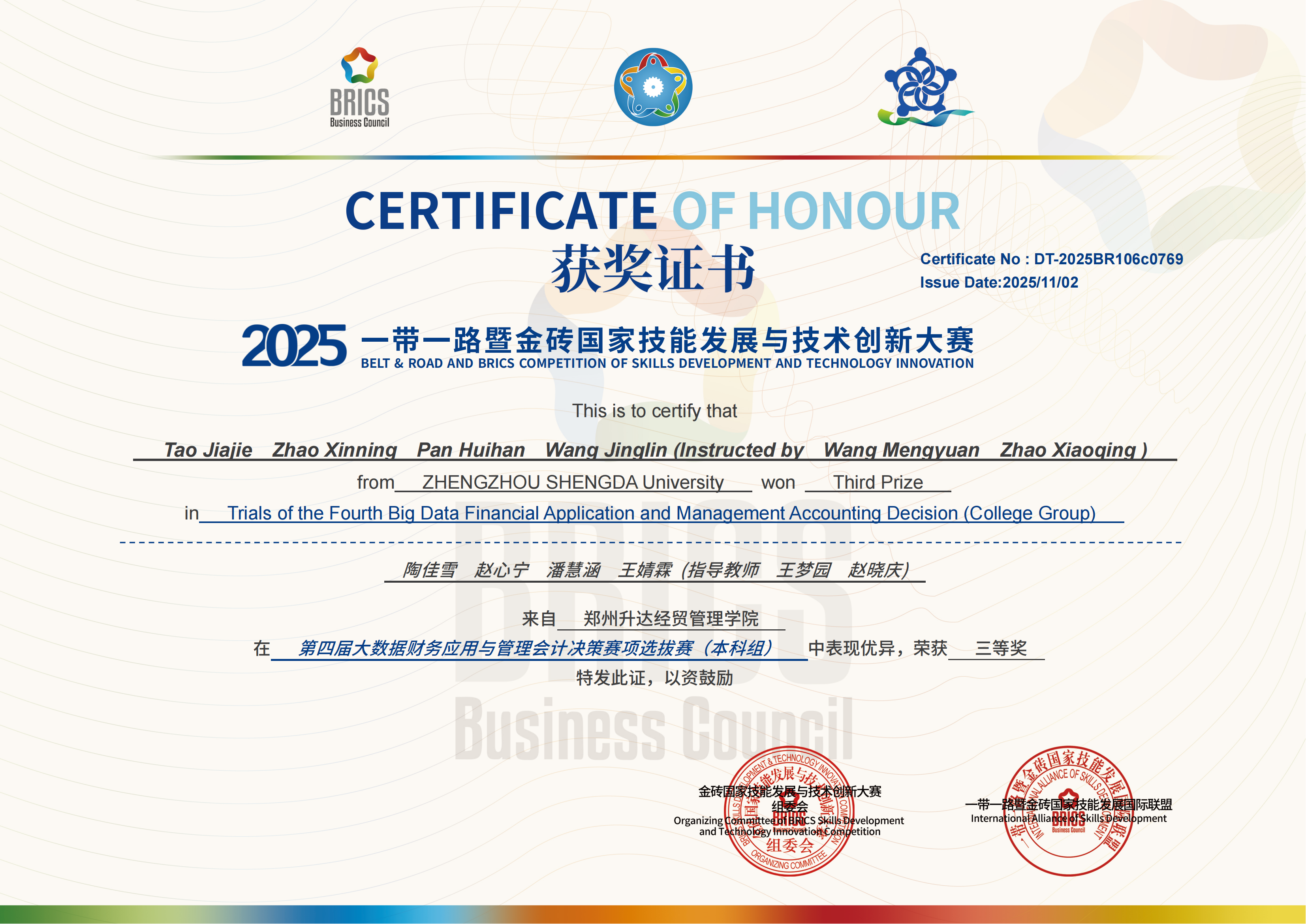 近日,第九届“一带一路”暨金砖国家技能发展与技术创新大赛全国赛圆满落幕,我校会计学院学生在“大数据财务应用与管理会计决策赛项”中以北区前30%的成绩斩获2项区域赛三等奖,其中一队晋级全国赛,斩获全国优秀奖,实现了学院参加金砖竞赛以来的成绩新突破,展现了会计学子扎实的专业素养和数智化应用能力。