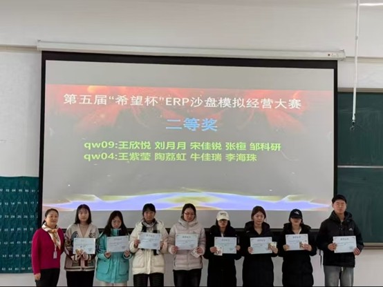 为培养学生的专业能力和综合素质,提升会计学子理论联系实践的能力,11月29日,由会计学院团委主办,会计学院ERP沙盘协会承办的第五届“希望杯”ERP沙盘模拟经营大赛在商管楼312教室举办,并于12月3日在教学四号楼118教室举办了颁奖仪式。参与此次颁奖仪式的嘉宾有会计学院党委副书记兼团委书记陈刚老师,会计学院团委副书记胡淑娟老师,ERP沙盘协会指导老师崔杰老师,社团管理中心主任孙翱以及社团管理中心副主任王莹。
