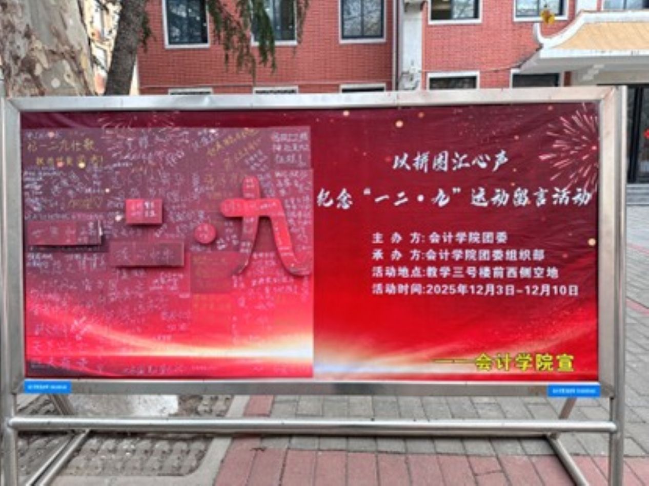 为引导会计学院师生铭记光辉历史,弘扬伟大的爱国主义精神,进一步激发会计学院学子们的民族自豪感和社会责任感。12月3日至10日,由会计学院团委主办,会计学院团委组织部承办的纪念“一二·九”运动系列主题活动于教学三号楼外砖铺路顺利举办。会计学院全体学子在课余时间主动参与。