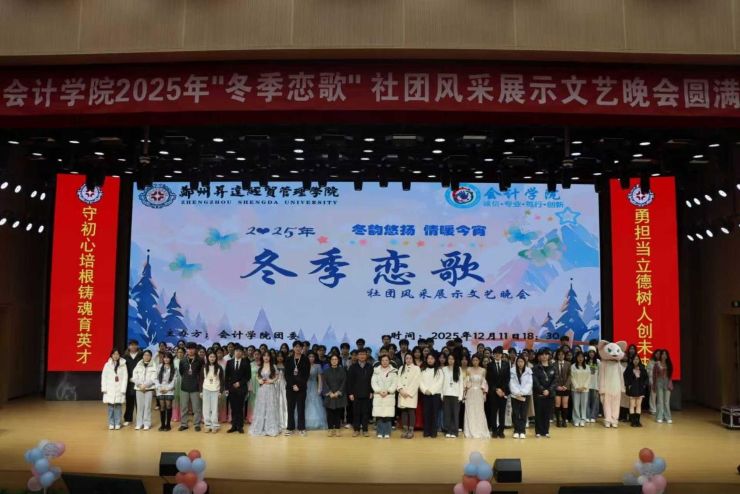 为丰富广大师生的课余文化生活,营造积极向上、多元包容的社团文化氛围。12月11日晚上6:30,由会计学院团委主办、会计学院社团管理中心承办的2025年“冬季恋歌”社团风采展示文艺晚会在新图书馆三楼报告厅隆重举行。会计学院党委书记张蕾、党委副书记兼团委书记陈刚、25级辅导员兼团委副书记胡淑娟老师、25级辅导员兼就业工作专员刘爽老师、25级辅导员兼统战专员姜早阳老师、各兄弟学院团学主要干部和会计学院团学骨干出席晚会现场,会计学院25级各班学生代表到场观看了本次晚会。