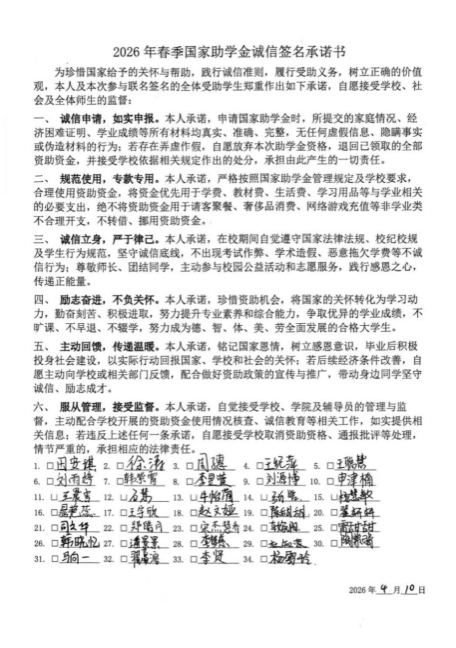 为强化诚信意识与责任担当,所有受助学生同步开展诚信签名承诺特色实践活动。全体受助学生在“诚信受助、诚信做人”主题横幅上郑重签名,并认真签署诚信承诺书,从诚信申请、规范用金、严于律己、励志奋进、主动回馈、接受监督等方面作出庄严承诺,以实际行动践行诚信准则,铭记国家与学校的关怀。