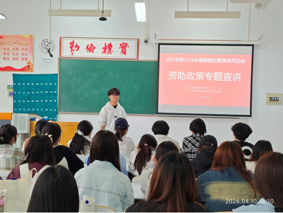 为深入贯彻国家资助育人理念,引导受助学生规范使用资助资金、树立理性消费观念,厚植感恩诚信、自强奋进的优良品格,4月份以来,会计学院2024级各班围绕“感恩、励志、诚信、节俭”核心主题,有序开展2026年春季国家助学金发放暨感恩励志教育系列活动。本次活动以政策宣讲、主题分享、诚信实践、氛围营造四位一体推进,切实把资助关怀转化为育人实效。
