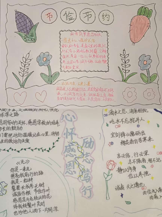 活动中,同学们以小组为单位,围绕国家助学金政策解读、感恩励志故事、诚信做人准则、勤俭节约倡议等核心内容,展开了热烈的讨论与创作。大家分工协作、各展所长,有的梳理资助政策要点,用清晰的文字传递政策温度;有的绘制感恩励志插画,用生动的画面表达对国家、学校与师长的感恩之心;有的设计诚信消费标语,用简洁的语言传递理性消费、杜绝攀比的理念。一张张手抄报色彩明快、排版工整,内容兼具思想性与艺术性,既展现了同学们对资助育人理念的深刻理解,也彰显了当代大学生自立自强、心怀感恩的精神风貌。