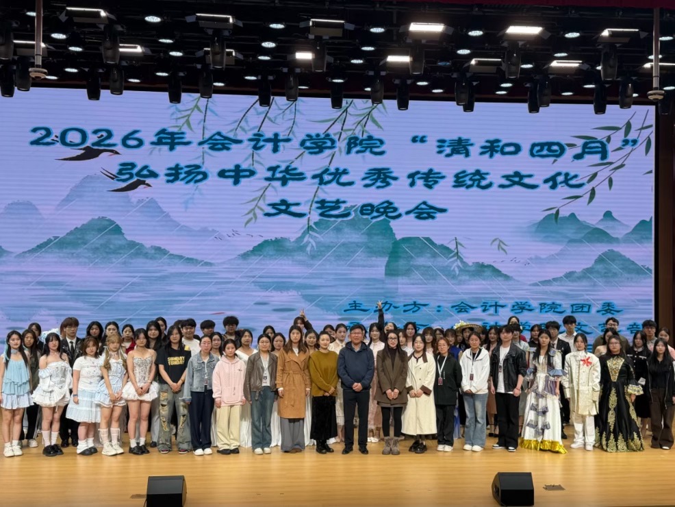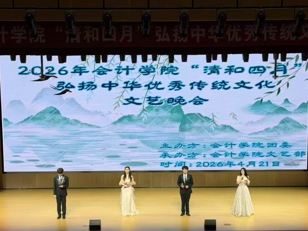 为弘扬中华优秀传统文化,展示会计学子的朝气蓬勃,共建积极健康的校园文化氛围,4月21日19:00,由会计学院团委主办,会计学院文艺部承办的2026年“清和四月”弘扬中华优秀传统文化文艺晚会于新图书馆三号报告厅精彩上演。会计学院党委副书记兼团委书记陈刚老师、团委副书记胡淑娟老师、25级辅导员焦阳老师等教师代表、第30届团委办公室主任周晓梦学姐、校级学生组织和各兄弟学院团学主要干部出席本次晚会,会计学院团学干部骨干及25级、24级学生代表到场观看晚会。