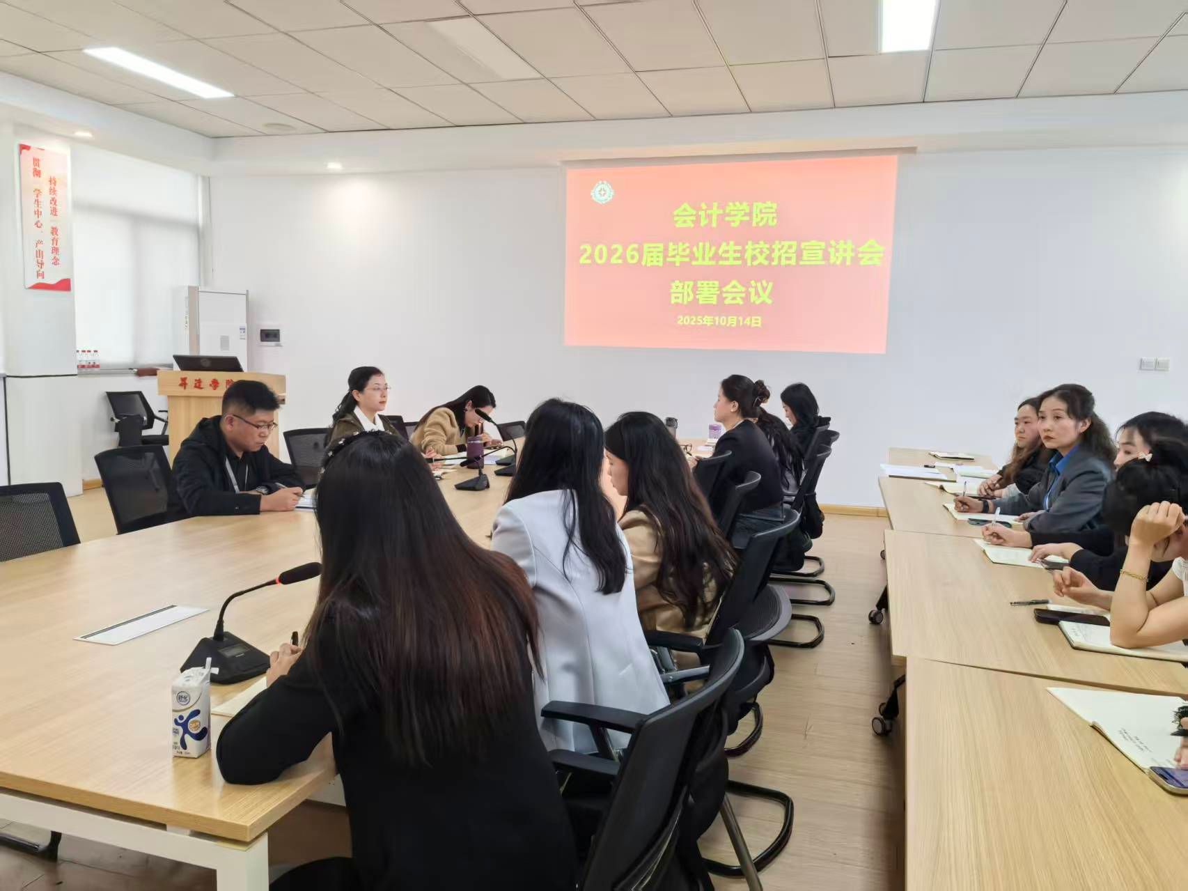为切实做好2026届毕业生就业服务工作,搭建毕业生与用人单位之间的高效双向选择平台,助力毕业生更充分、更高质量就业,10月14日14:30,会计学院在教学4号楼209会议室召开了2026届毕业生校园招聘宣讲会工作部署会议。会计学院党委书记张蕾、党委副书记兼团委书记陈刚、就业专员刘爽以及全体辅导员参加了此次会议。会议由张蕾书记主持。