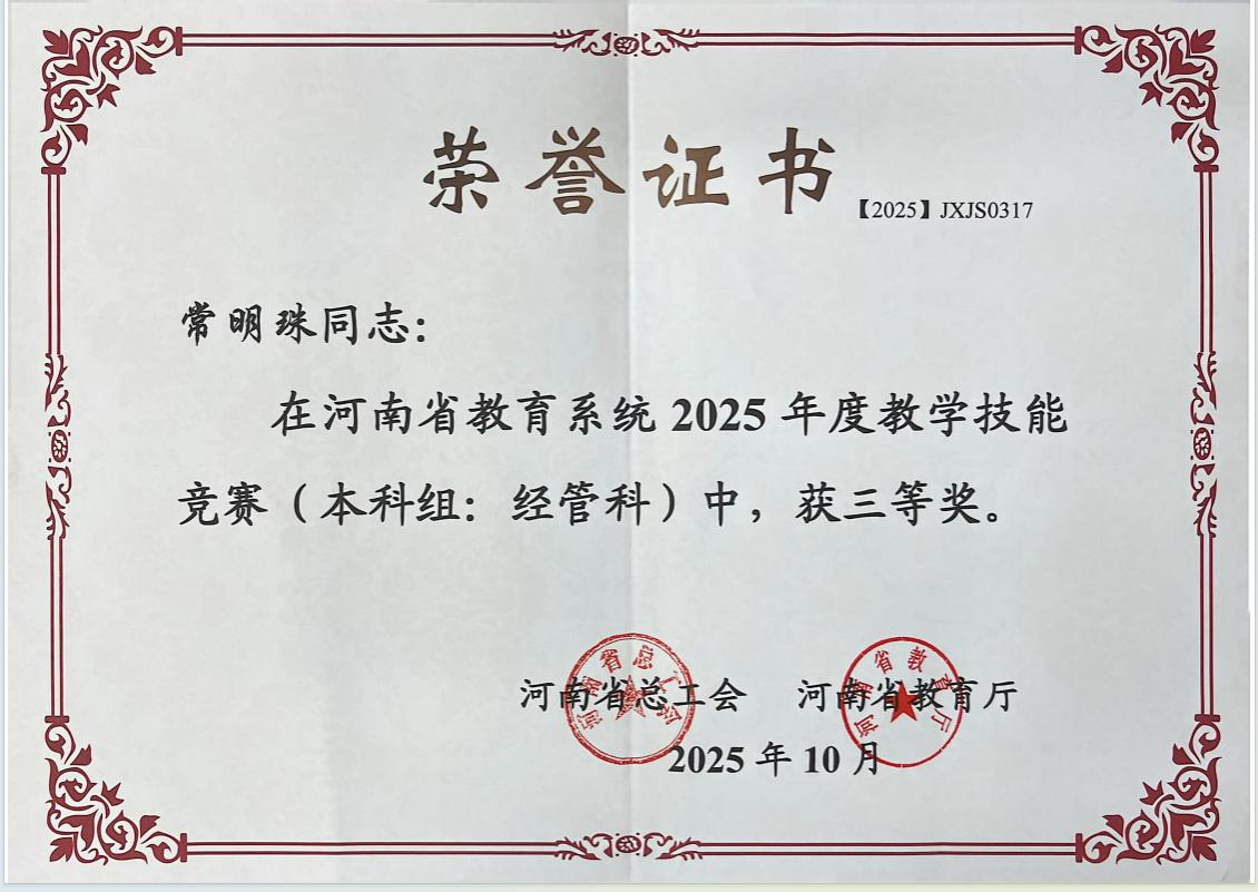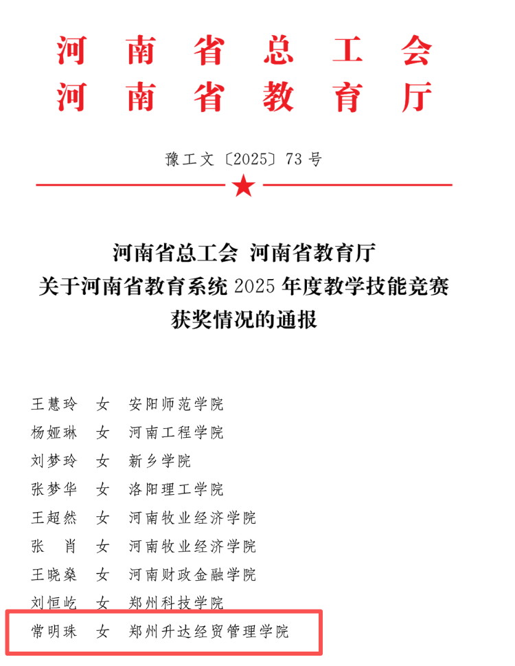 近日,河南省总工会、河南省教育厅联合发布了《关于河南省教育系统2025年度教学技能竞赛获奖情况的通报》〔豫工文〔2025〕73号〕。我院教师常明珠凭借出色的教学表现和创新的教学设计,在经管科组竞赛中脱颖而出,荣获三等奖。
