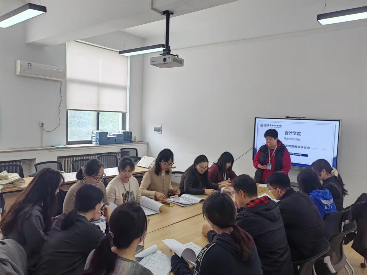 为全面检验本学期教学运行状况,持续提升教学质量与管理水平,管理会计教研室于10月23日在教学4号楼214室集中组织开展了2025至2026第一学期期中教学检查工作,重点围绕教学资料的规范化与完整性进行自查与互查,取得了阶段性成效。