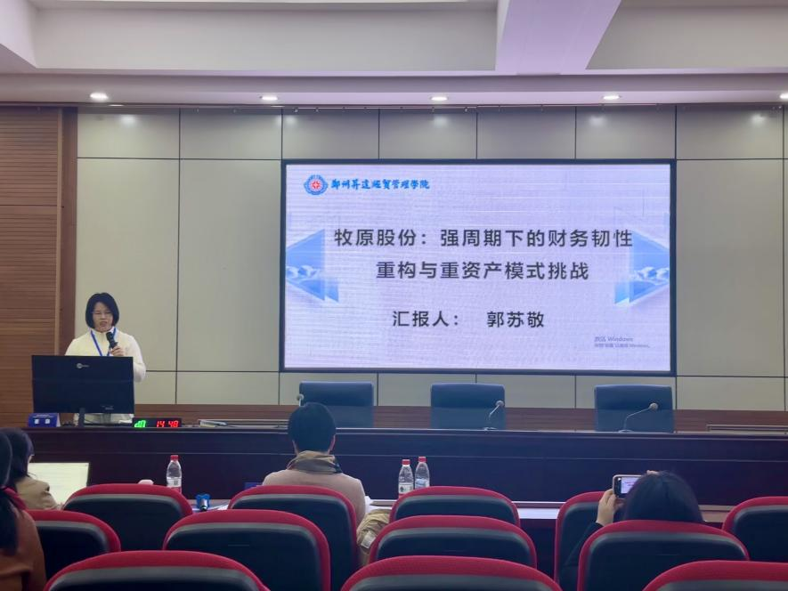 案例点评与交流环节,参会教师分组进行案例展示,戴鑫、刘海鸥、刘端等专家针对展示案例进行精准点评,提出具体修改建议。财务管理教研室教师郭苏敬提交的《牧原股份:强周期下的财务韧性重构与重资产模式挑战》入选分组交流案例,在财务管理领域专题研讨中进行展示,得到点评专家的充分肯定与针对性指导。